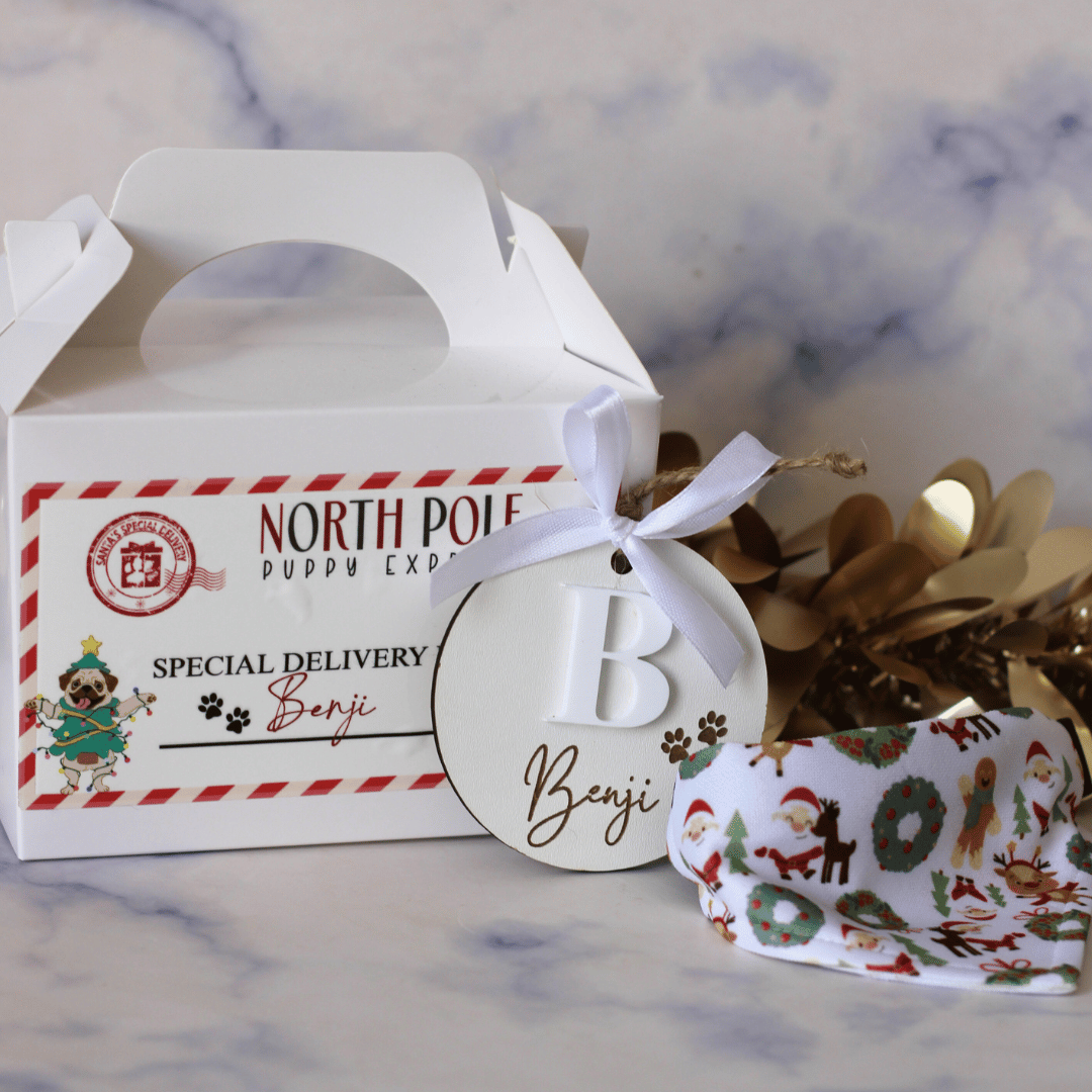 Celebrate your furry friend this festive season with a matching personalised bandana and ornament set. Perfect for Christmas photos, family matching moments, and adding a little sparkle under the tree for your four-legged family member.