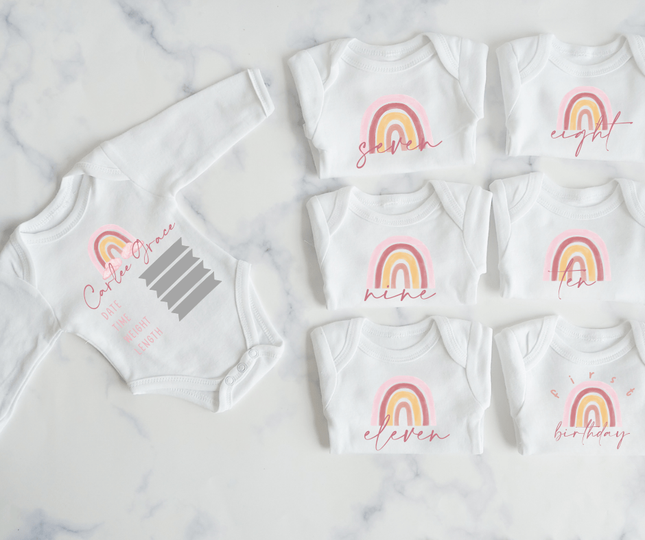 Celebrate your little one’s milestones with a beautiful milestone set. This set includes 13x 100% Cotton Onesies with a 3 button closure in long or short sleeves.